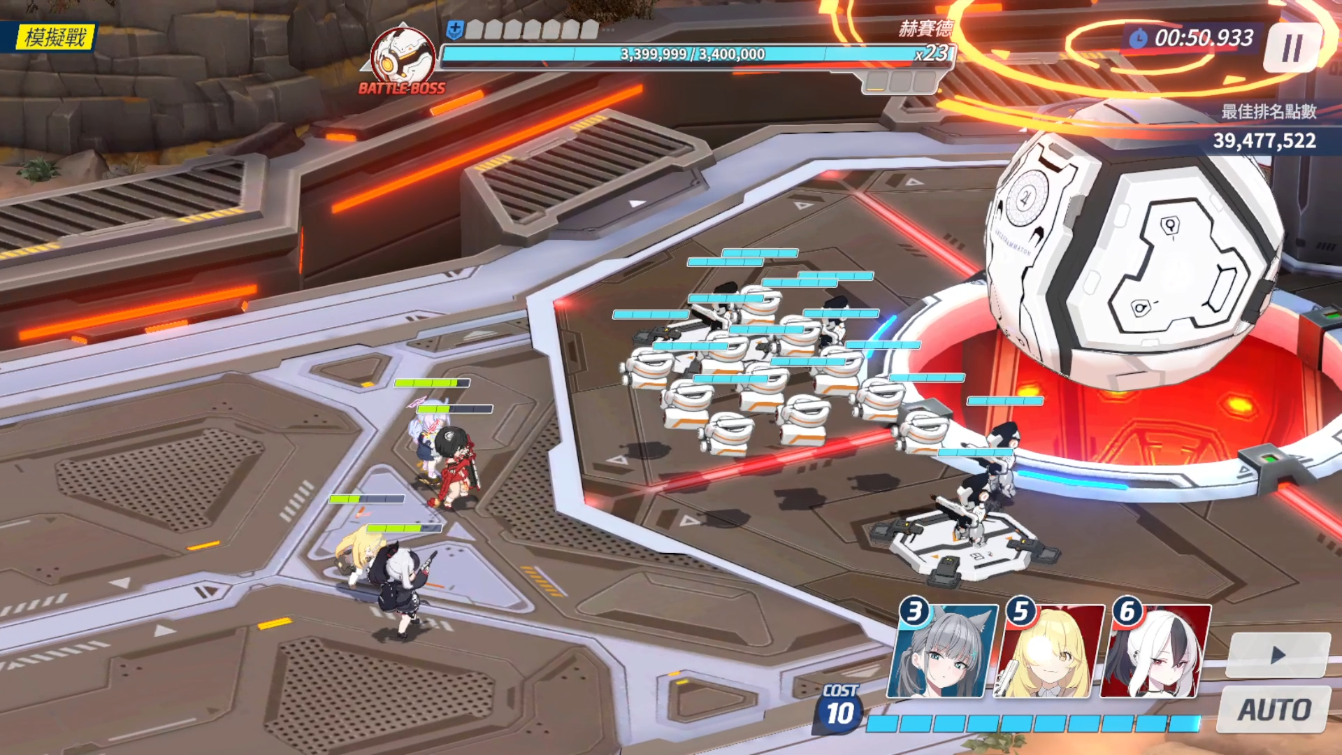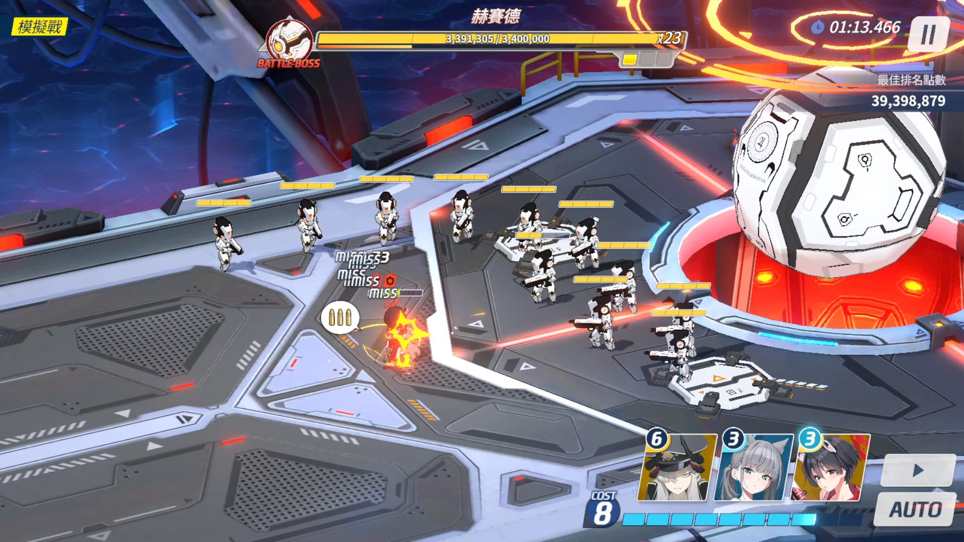 赫赛德是一个十分特殊的BOSS,在绝大多数时候它只是静静地漂浮在空中,输出可以说全部依赖召唤出的机械士兵。因此这场战斗整体分为两个环节:有机械士兵时需要尽可能地消灭机械士兵,在赫赛德陷入无力时尽可能对其输出。虽然机械士兵在场上存活一段时间后往往会造成不小的威胁,不过只要能在真正造成威胁前将其消灭,那么适当地留怪用于回复费用往往也是一种策略。整体而言赫赛德的难度并不算高,不过对于缺少强力清杂的老师而言还是很难对付的,并且这场战斗敌方微妙的闪避值也对低命中的学生很不友好。那么我们下期再见(゜▽゜*)♪