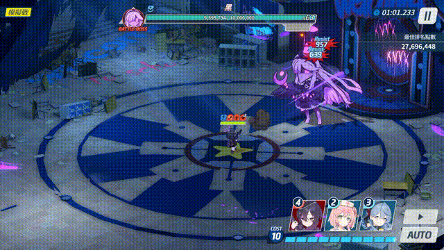 二阶段 (黑) | EX及以下难度 | 行动模式大致为固定顺序循环,以下以带圈数字代表连续普攻次数; 单次循环的行动顺序为:②-突击1-②-突击2-②-突击3; 若黑陷入无力状态,则下次行动从头开始循环; 其中突击1、突击2、突击3分别使用样式一/四/七、二/五/八、三/六/九 (使用的样式根据ATG阶段决定) |