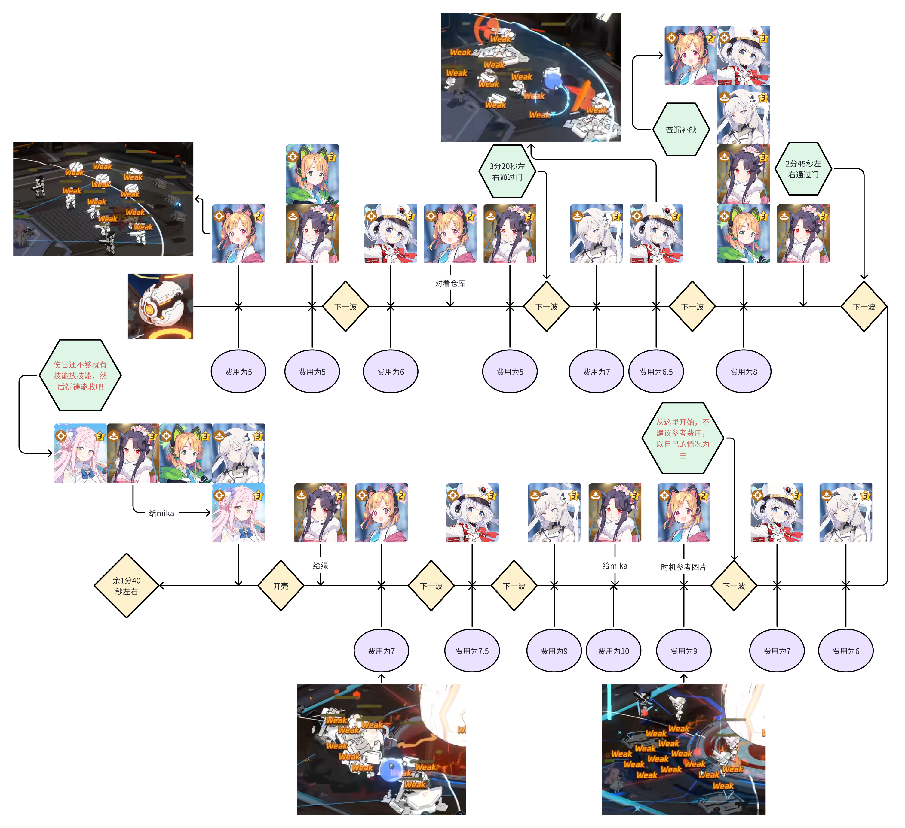 第2刀:先水忧上BUFF,9费开壳,日鞠给mika上BUFF后mika打,憋3费用伊织打,伊织打2-3枪会关壳。此时剩大概285-290W血,剩300W以上请重开。之后大萝和伊织配合清怪,中间穿插水忧BUFF,开壳后重复日鞠mika伊织。正常情况下到这里结束,结果2710W分左右。如憋的费不是很够,可以考虑最后一波小怪留一个,用伊织开大来打(剩下两枪会结结实实打到hod上面,争取开壳时间)。