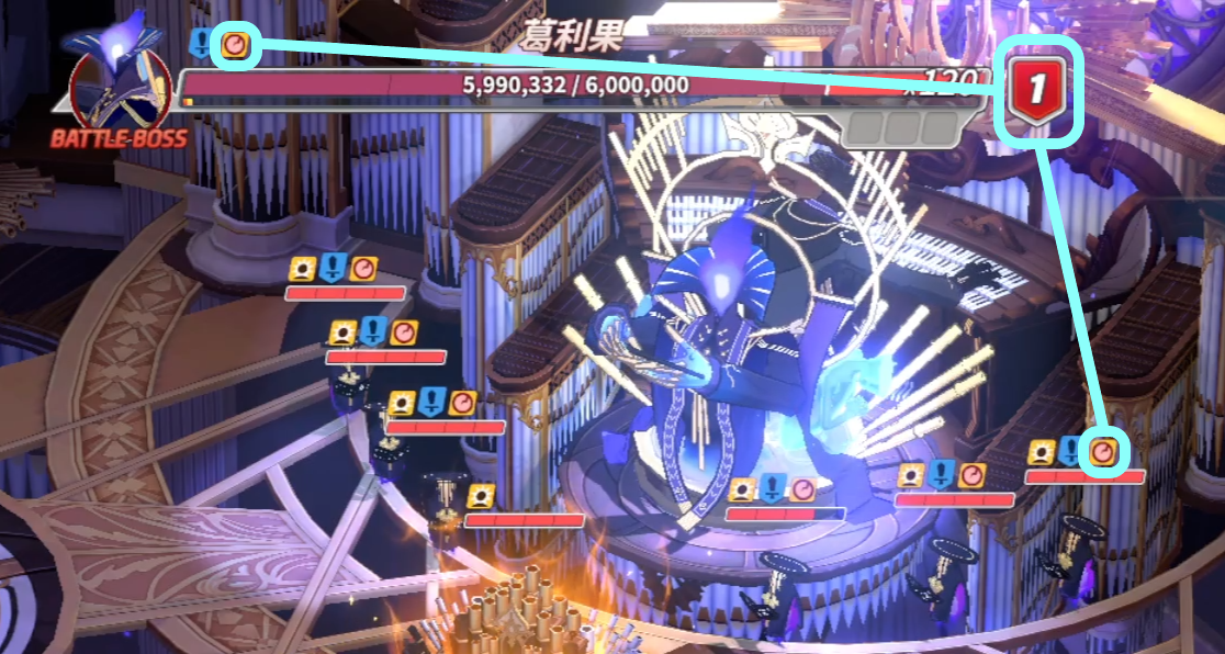 TOR及以下难度 LUN难度 激活我方阵营侧的背景管风琴,金色光纹完全形成后: 对所有我方单位造成攻击力500%的必定暴击伤害并施加“攻击力降低40%”(持续120秒,可叠加) | |||