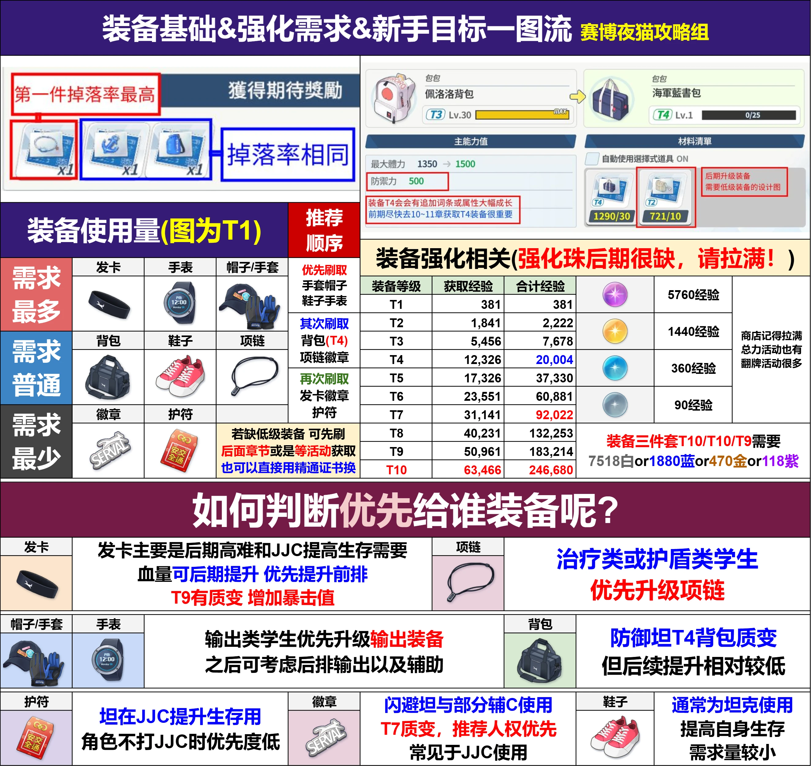 总结:由于帽子、发夹、手表的需求量相当庞大(帽子为大部分强力主C使用,而发夹和手表截至4.5周年进度均有130+学生使用),刷取思路一般以这三者为主导,其他装备做为副刷取即可(手套、项链优先级仅次这三者,鞋子、包包、徽章、护符在刷多的情况下很容易溢出)。尽可能挑选能同时刷取多个高需求装备的关卡刷取即可。