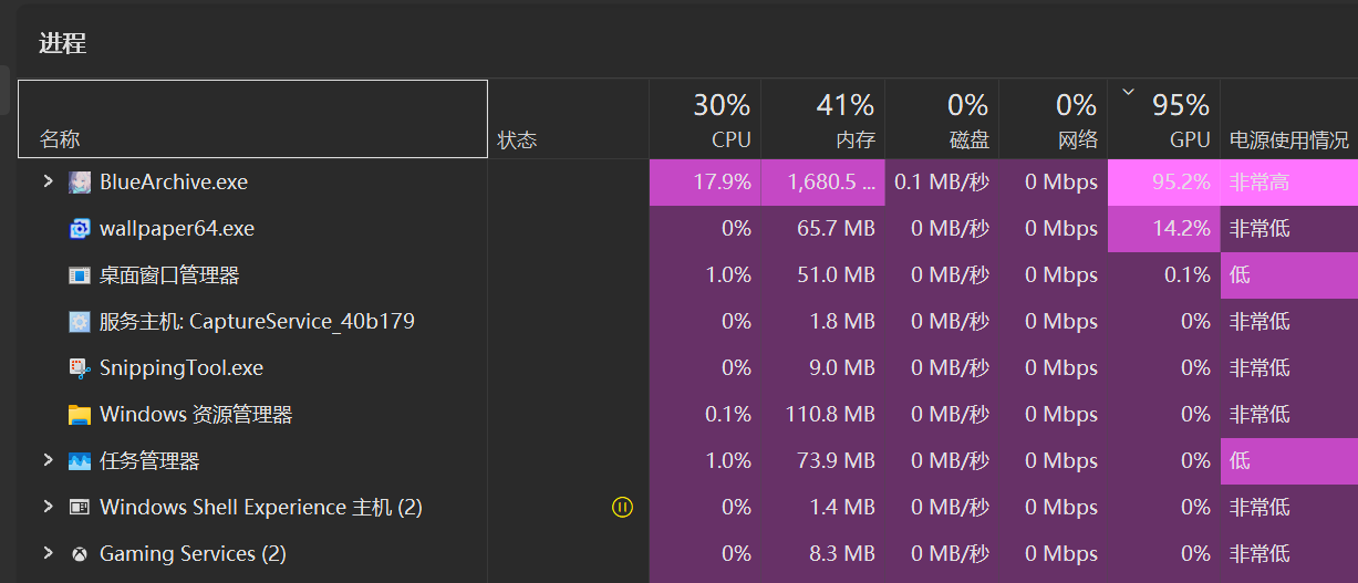 各位seisen在使用蔚蓝档案steam用户端体验游戏的时候发现后台显卡资源占用过高的情况(如图所示)