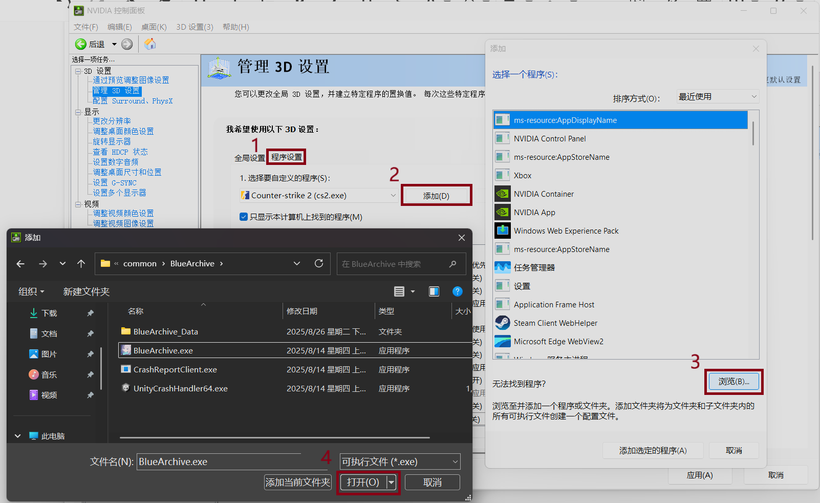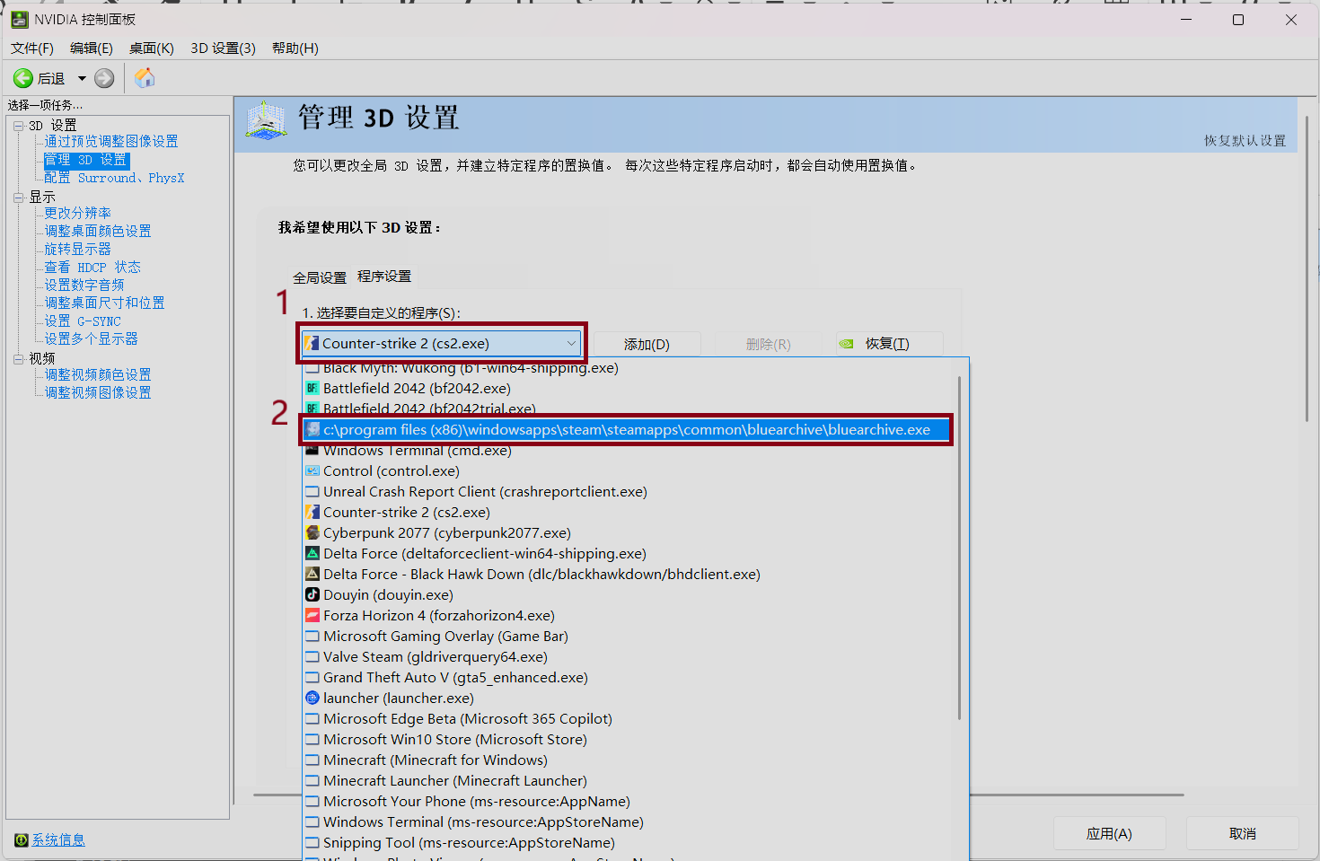添加成功后可以在程序设置-选择要自定义的程序里找到"BlueArchive.exe",然后选中它
