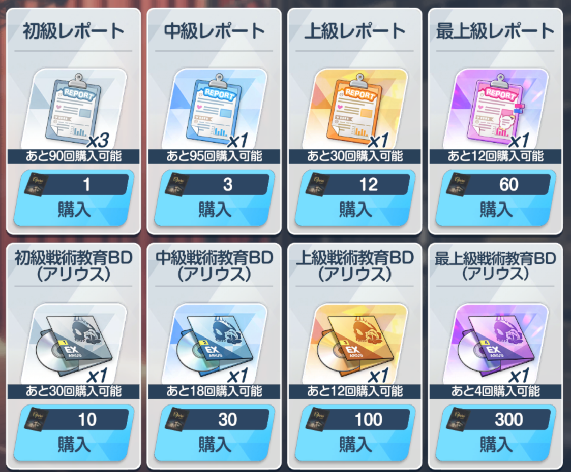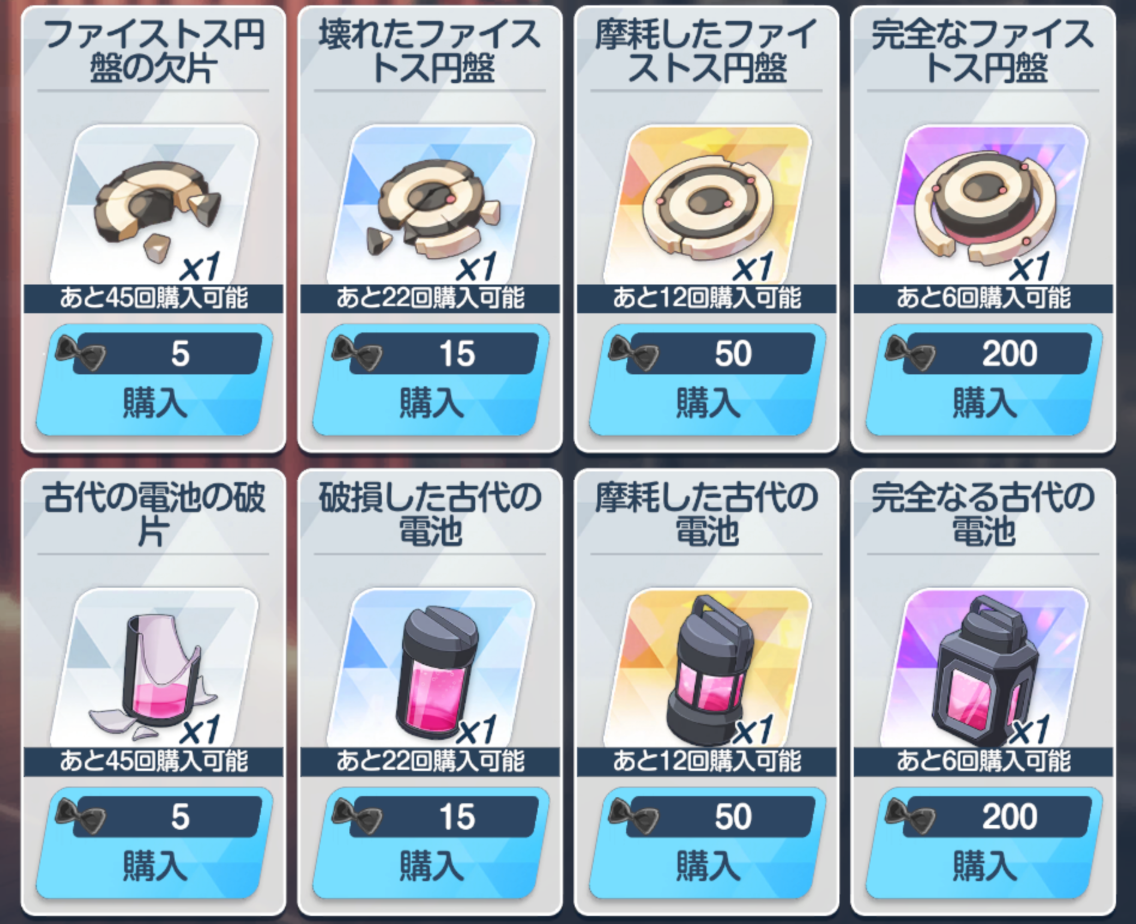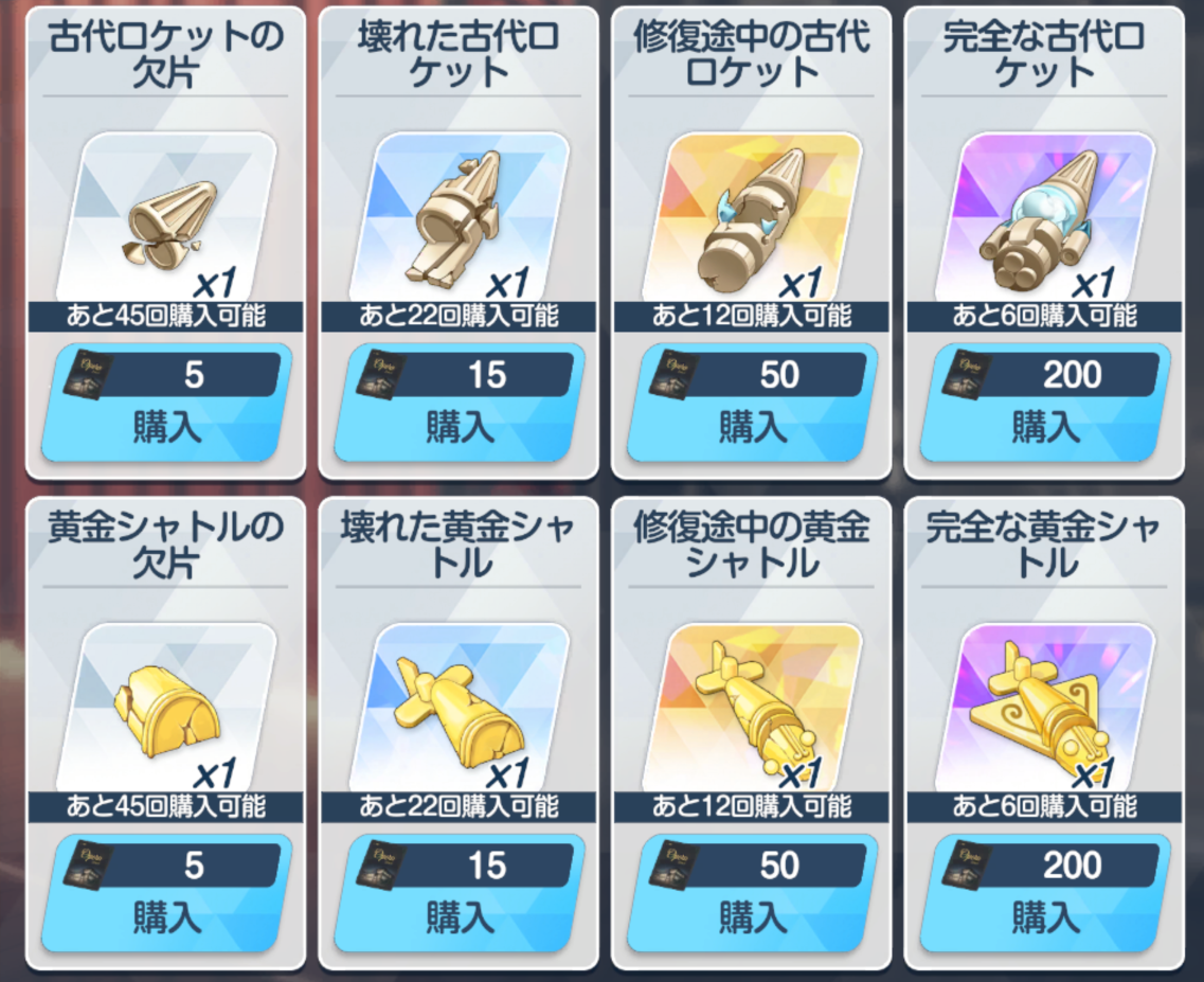 ![]() | 经验书 可换 BD 必换 远古材料 古代火箭 可换(演习商店有换) 远古材料 黄金穿梭机 可换(演习商店有换) 橙礼物 可换 紫礼物 必换 家具(礼服阿露互动) 自选 |