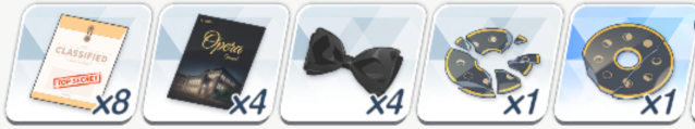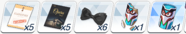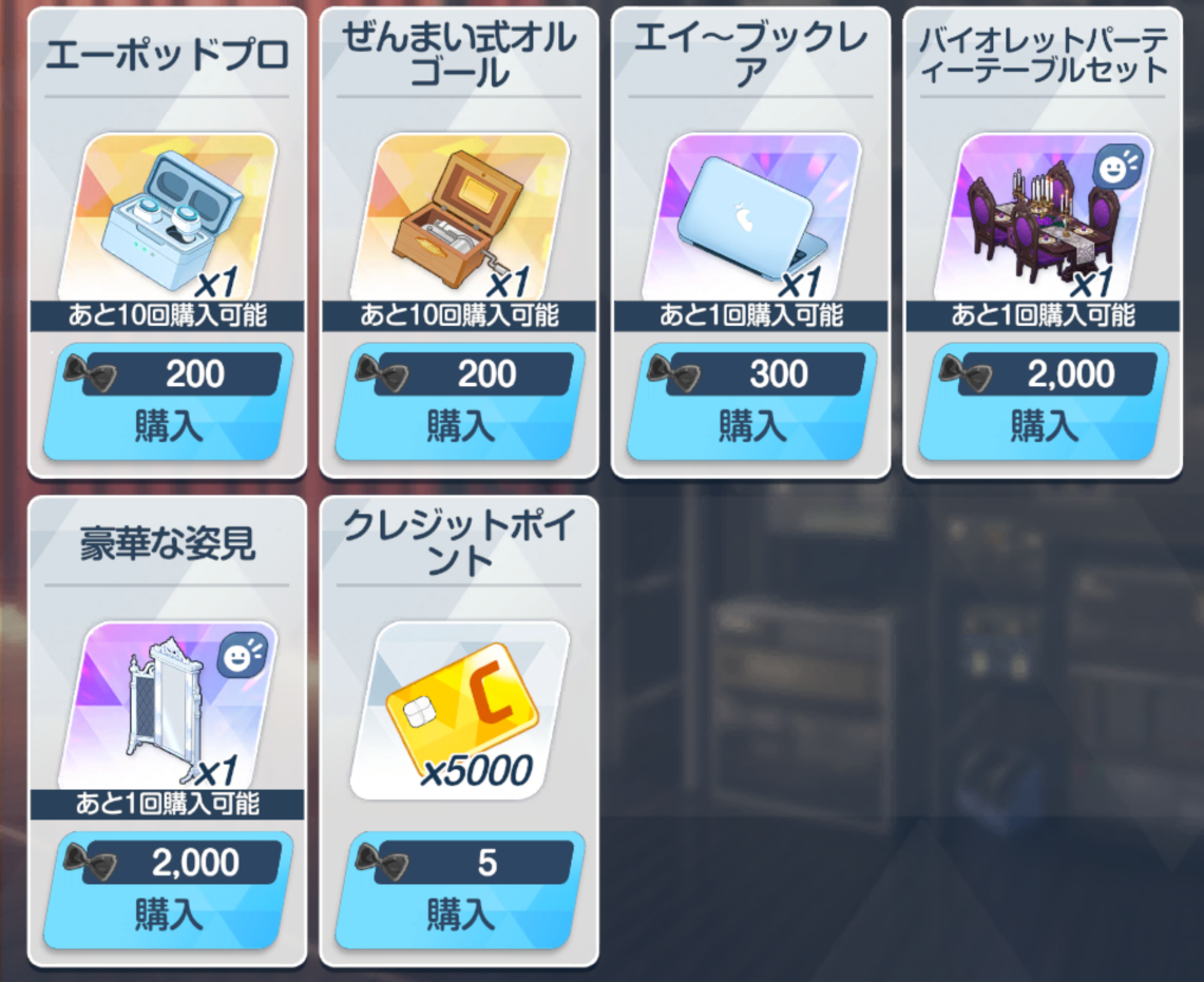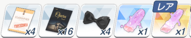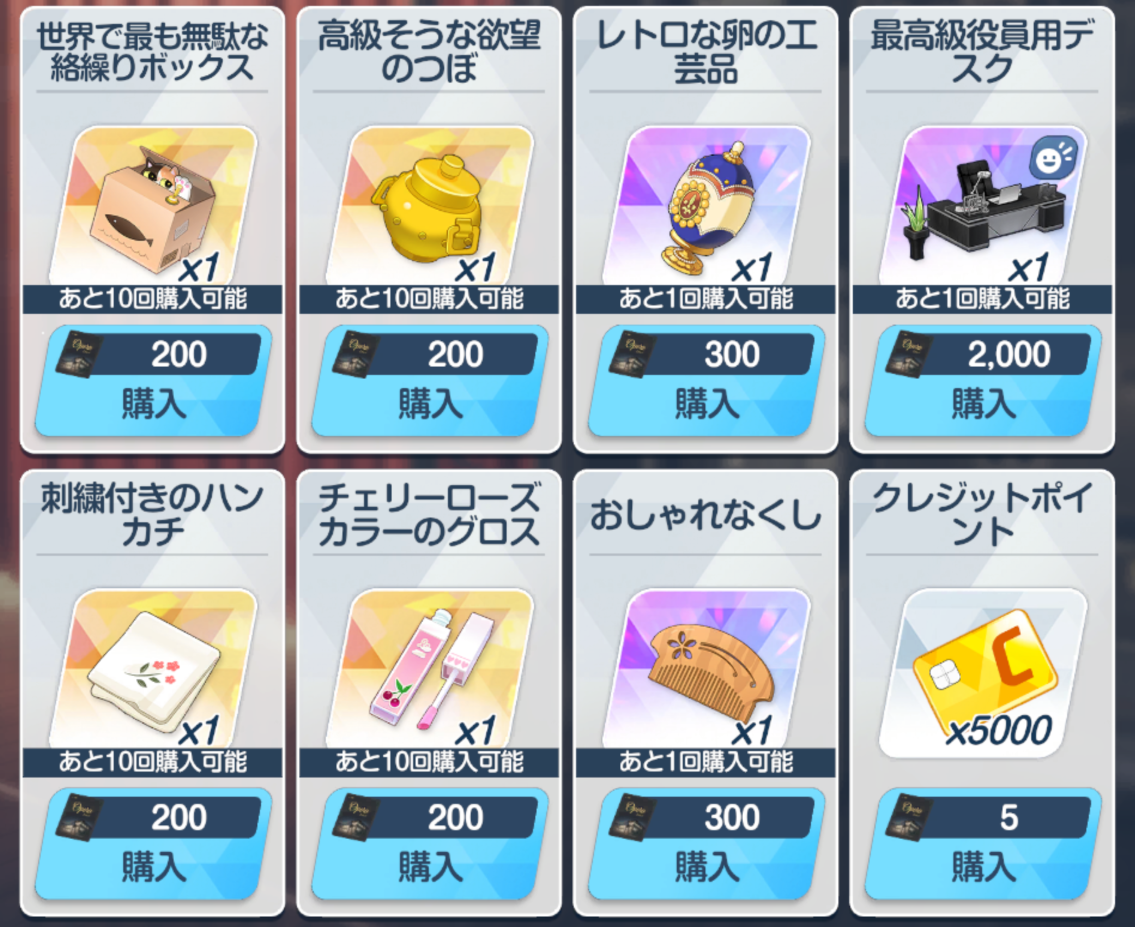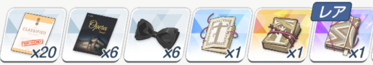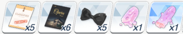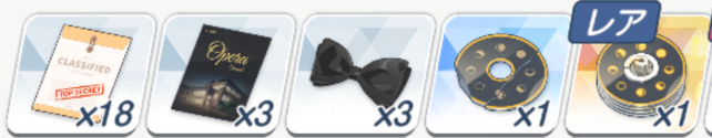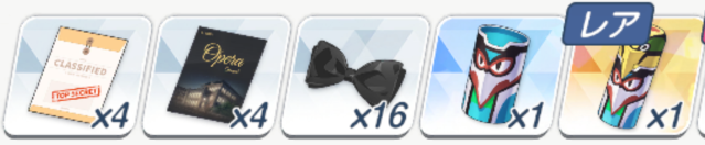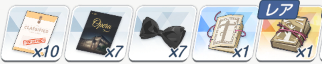 ![]() | 强化球 可换 技能书 必换 远古材料 圆盘 可换 远古材料 电池 可换(演习商店有换) 橙礼物 可换 紫礼物 必换 排队餐桌(礼服佳代子互动) 自选 豪华全身镜(礼服纱织互动) 自选 |