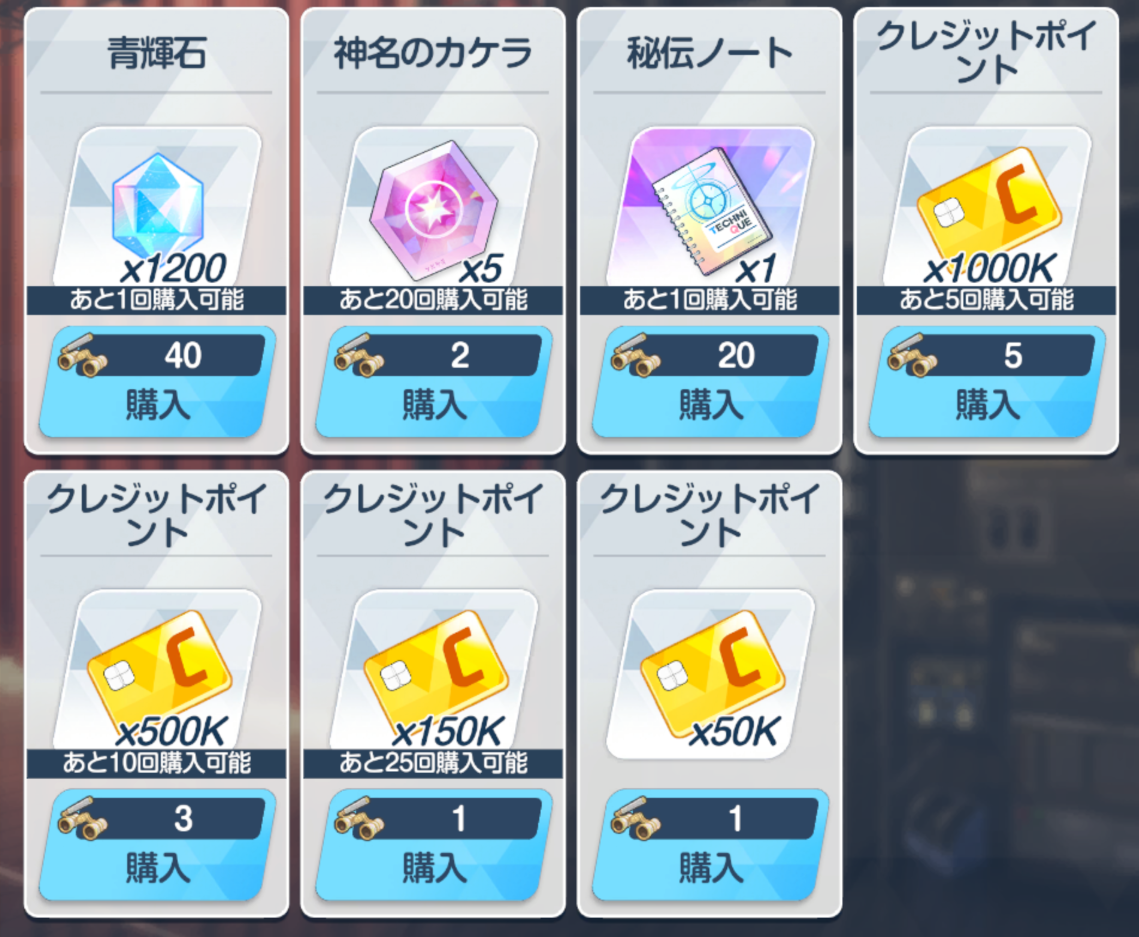 ![]() | 1200青辉石 必换 神名碎片 必换 秘传 必换 信用1000K (从上往下换) 信用500K 信用250K 信用50K |
