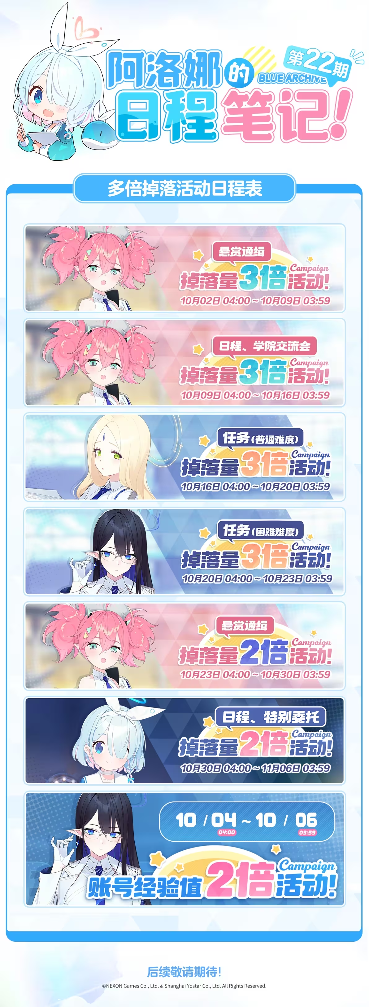 日程笔记仅供老师参考未来版本更新后活动内容及招募时间等内容,具体活动规则还请老师关注后续官方社媒及游戏内、官网的公告。下方附带了当期版本日程笔记长图,其中包含了期间的活动开放时间安排以及多倍活动的开启日程,以供老师参考~