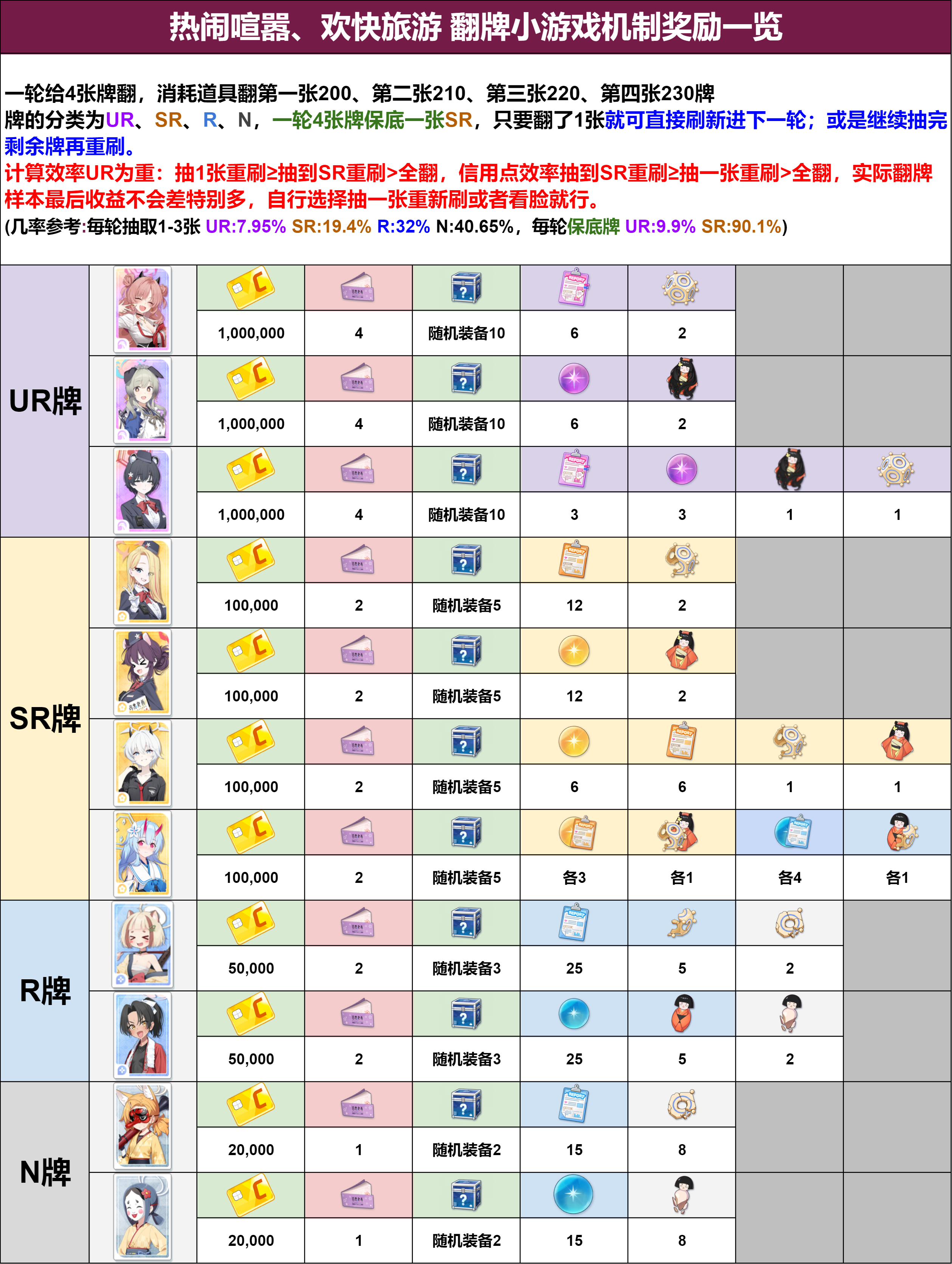 活动懒人包 因为本次活动的素材用的会比较少,基本上是专门刷其他的资源(满加成搬商店基本都是2.4x以上的效率),不抽新角色90%加成效率会更低,不过还是总体趋近于2倍期望值。如果新手资源很缺,可以考虑搬空,不然就看个人需求了。翻牌实际上受个人的脸色问题,上下限极大,概率可以参考奖励一览。 无新角90%加成效率(对比特别委托L):合计2.14倍;经验书0.51倍,金币1.03倍,强化珠0.58倍。
