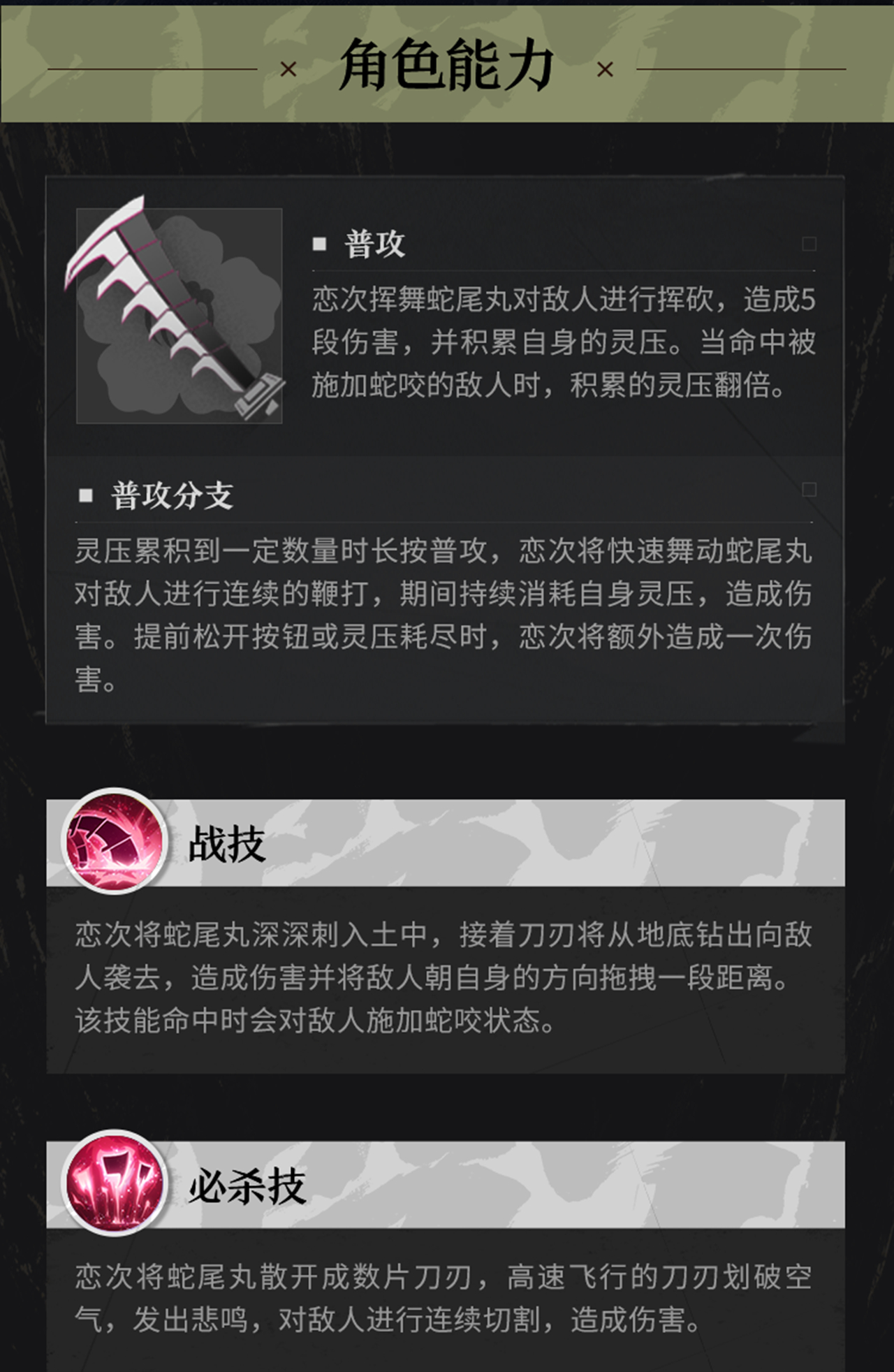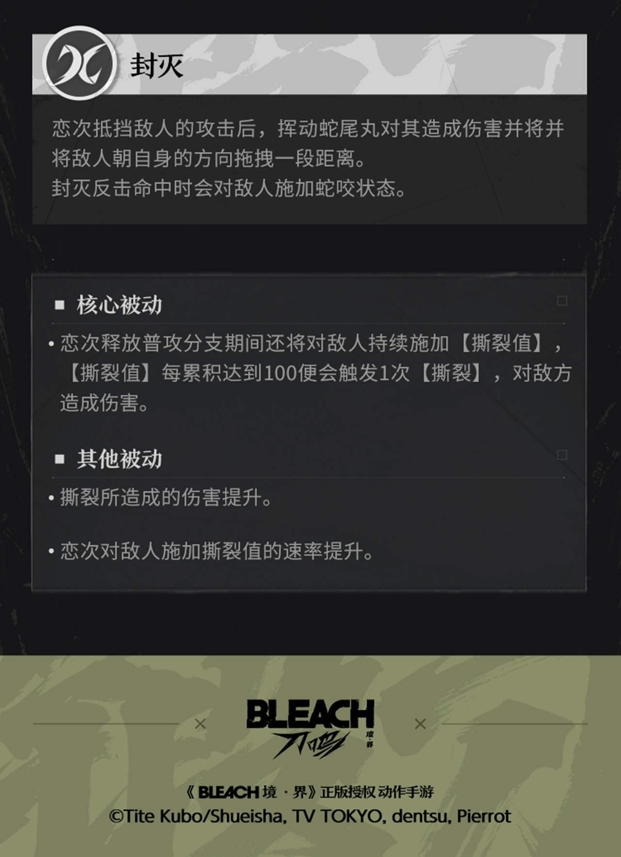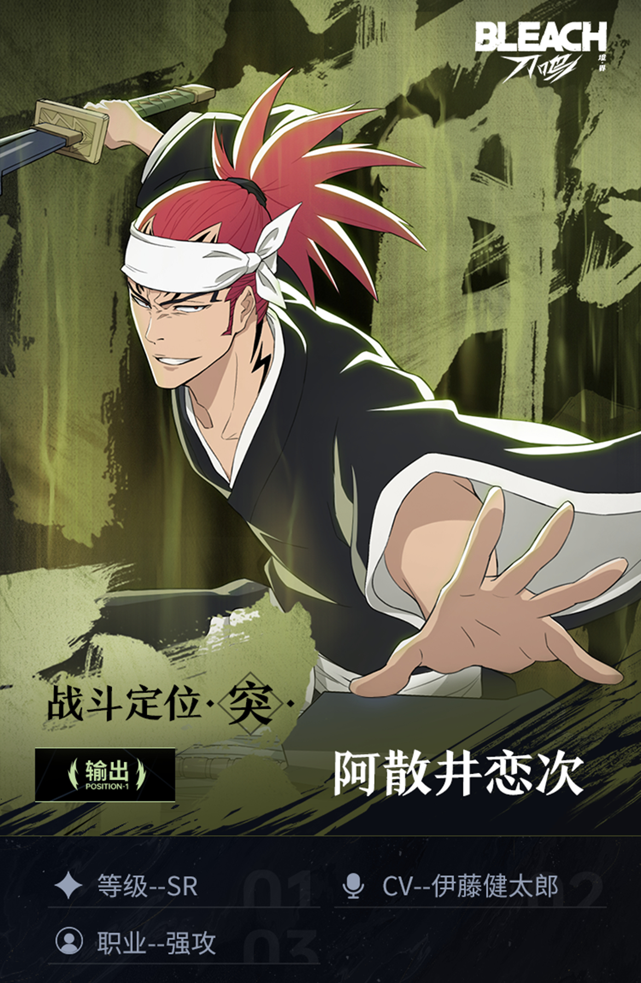 六番队副队长,性格是与朽木队长形成鲜明对比的热血类型。与朽木露琪亚是青梅竹马,在真央灵术院学习期间露琪亚被朽木家收养,他令人意外地给予了祝福和支持。从那以后,他便以超过朽木白哉为目标继续锻炼。兴趣是收集护目镜。 游戏中的恋次是一名中距离范围输出角色,攻击时可高频触发撕裂伤害,而且有一定聚怪控制能力,在对群输出时有不俗的优势,是非常可靠的队友。一起来看看恋次的技能吧!