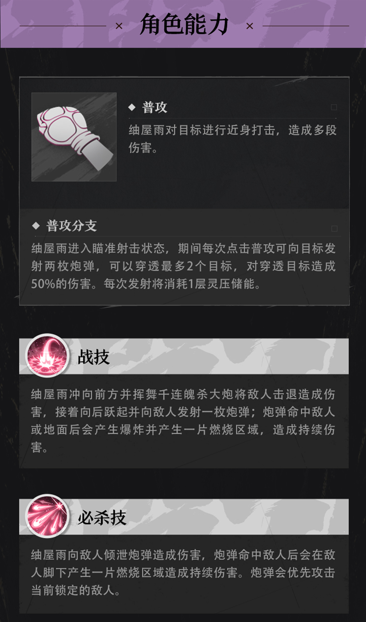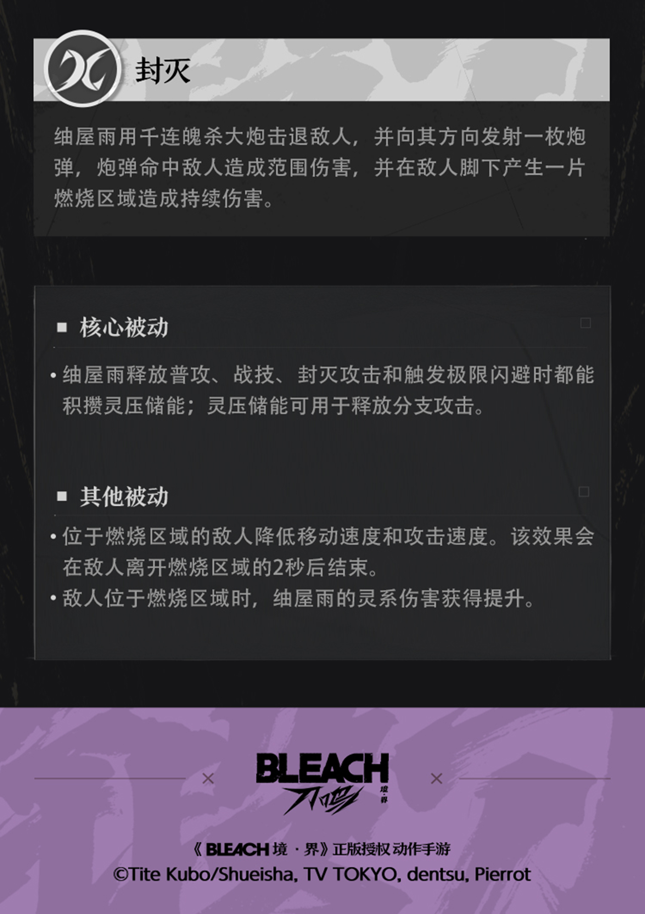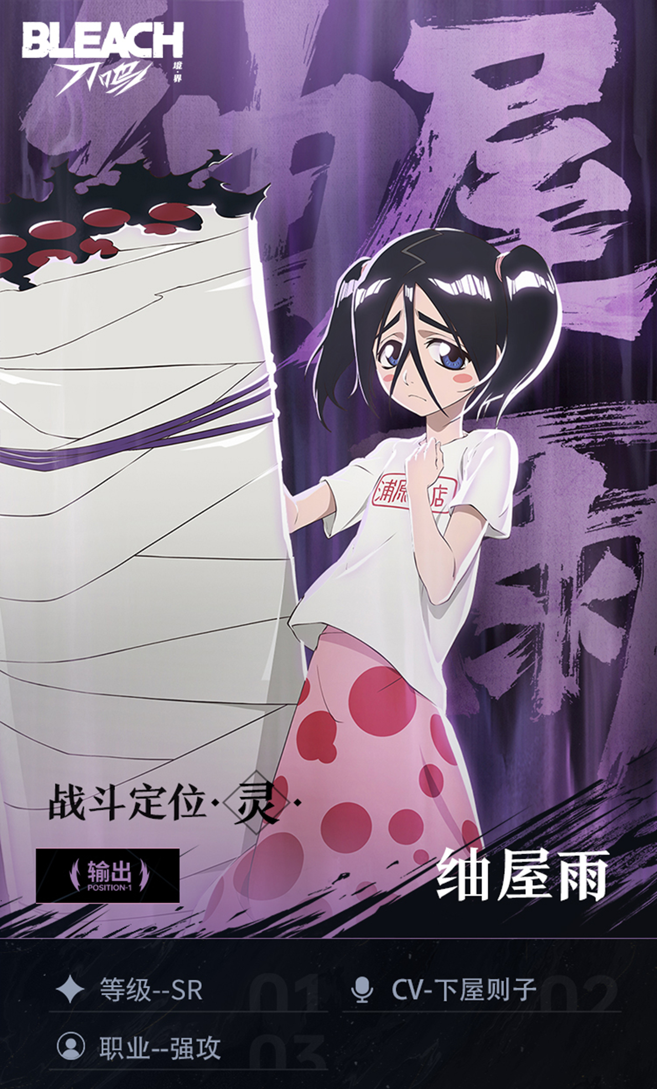 浦原商店的店员,具有超人的战斗能力。也是空座町防卫队的一员。 游戏中的她是一名强力的输出型角色,拥有使用灵子大炮持续射击灌伤的进攻模式,可在场景中留下燃烧区域造成持续范围伤害,并提升自身伤害,一起来看看她的技能吧!