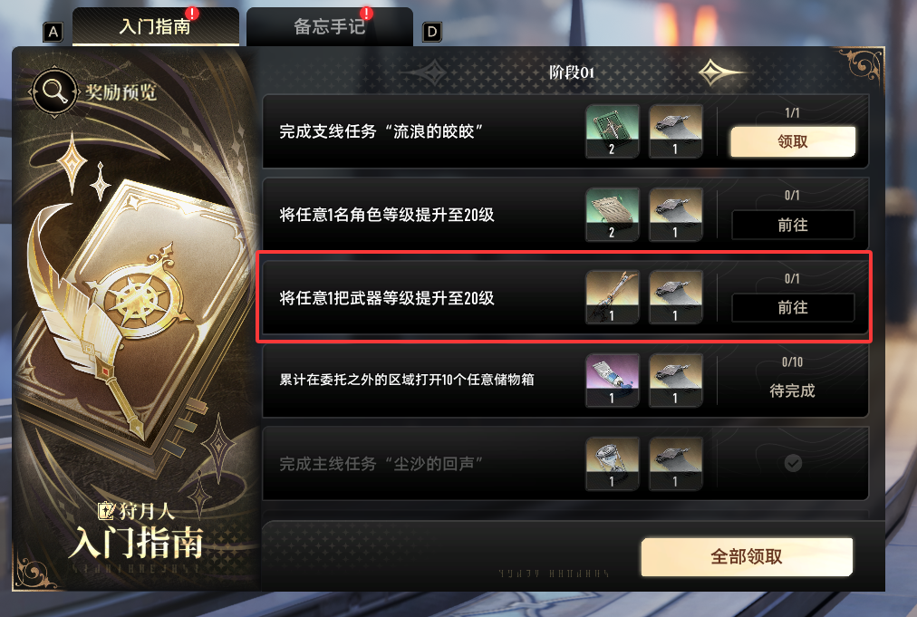 ①新手任务获取:【狩月人】/【销骨】/【嘶鸣】/【珀辉刃】