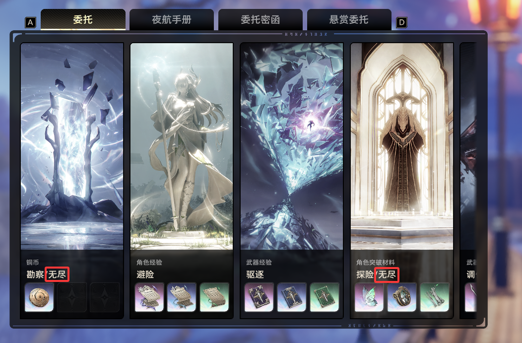这个阶段比较考验肝度,需要刷比较多的小怪,这里就比较推荐在委托里面 选择带有无尽字眼的副本进行材料获取