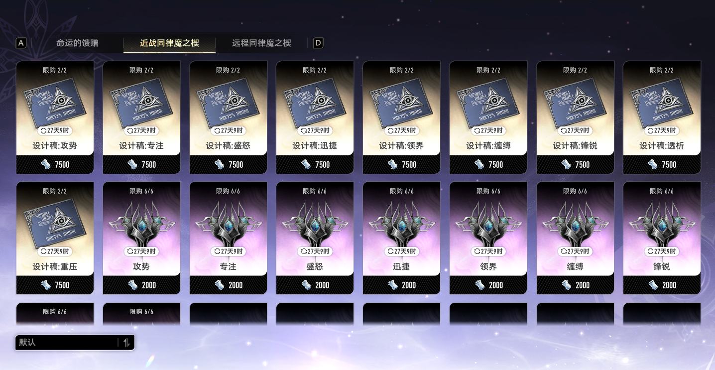商店兑换推荐:【刀尖把戏】、【幻光闪烁】、紫色品质的同律武器魔之楔、金色同律武器魔之楔设计图