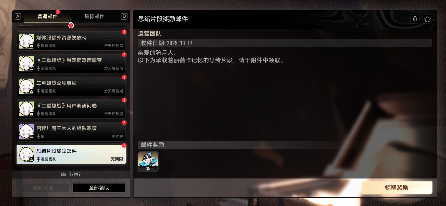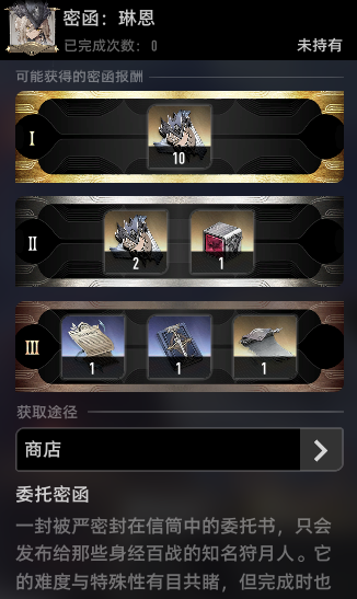 委托密函每十次通关,保底获得一次最高阶奖励,但是最高阶奖励往往可以提前拿到,分别可以获得10个角色碎片/1个武器设计稿,同时角色委托密函的第二阶奖励也有概率获得角色碎片
