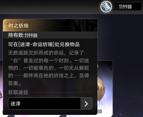 时之纺线作用:可以用于兑换更改攻击模组的近战武器魔之楔,以及同律武器魔之楔