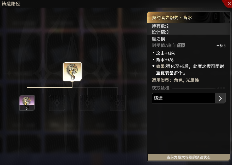 【契约者】系列魔之楔在强化至+5之后,可以重复携带,但是金色品质和紫色品质的同名【契约者】魔之楔不可以一起携带。