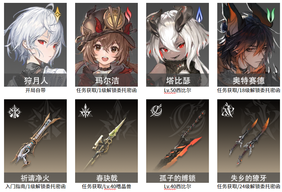 公测版本一共会有8名五星角色,以下是这8位角色和对应专武的获取方式: