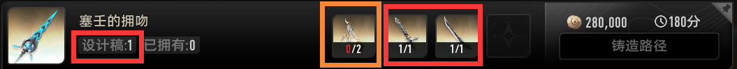 如图所示,铸造武器需要的是设计图和材料,其中红框部分为武器密函任务获取,不同武器可能会出现2-3种,橘框内部分为泛用素材。泛用素材只和武器类型挂钩,近战武器需求的一定是利刃药剂,远程武器需求的一定是爆弹,铸造两者所需的材料也完全一: