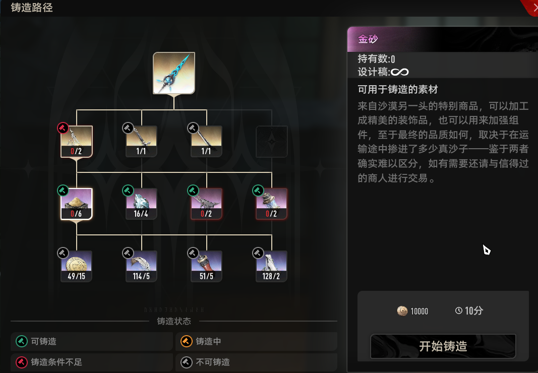 游戏内除了直接赠送的武器外均需要锻造获取,锻造武器中除了用于完成任务的祈请净火外均为同样的素材需求。