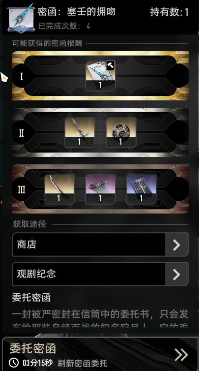 在拥有武器密函后,在委托密函里选择对应的密函即可定向刷取,此处可以看到密函通关后可能出现的3档奖励。其中会出现2-3种武器材料和设计图,其中对应设计图为1档的大奖,出率10%大约刷10把可以获得。锻造武器第一步:刷密函刷出武器零件+设计图。每个武器的密函出处可以参考武器图鉴。