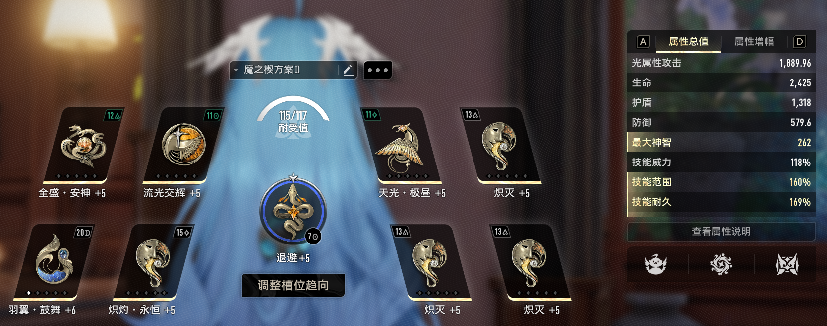 以及,如果追求伤害最大化,可以让协战队友携带【全身·安神】,将「菲娜」的【全盛·安神】更换为【全盛·昂扬】,如果感觉神智消耗过大,让队伍中两位角色选择【全盛·安神】即可。