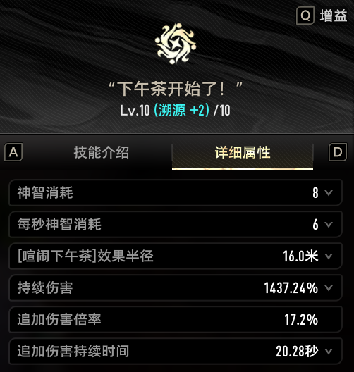 领域展开及切换时,为自身和队友附加对应属性的追加伤害。[喧闹下午茶]持续期间,对领域内的敌人2秒造成1次对应属性的持续伤害。