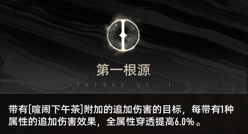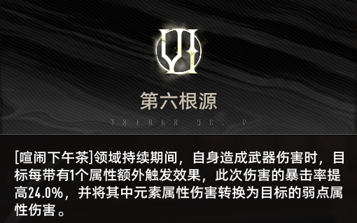质变溯源,第六根源极大程度的强化「菲娜」的武器输出能力,让「菲娜」自身的加成效果可以对自己产生更强的作用,「菲娜」本身可以造成五种属性的额外触发效果,因此拥有120%的武器伤害暴击,最关键的是她可以将元素属性伤害转换为目标的弱点属性,克制属性会造成4倍伤害,因此可以极大地提升「菲娜」在面对拥有弱点属性敌人时的输出能力,使得「菲娜」的定位不再是完全意义的辅助,可以进行输出方向的扩展。