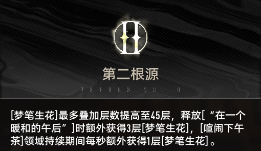 自身获得永续的光属性追加伤害。释放["在一个暖和的午后"]时,获得6层[梦笔生花];[喧闹下午茶]领域持续期间,每秒获得1层[梦笔生花],最多叠加30层。