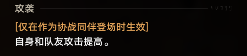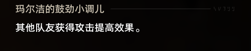 直接进入主题:玛尔洁全部的价值就在于被动这条里的被动2和被动3,2条加起来合计无条件给队友+85%的角色攻击,虽然加攻不算很厉害的乘区,但是前没有更好的泛用辅助,这点就可以让她作为绝大部分队伍的辅助登场。除此之外的技能都属于赠品。