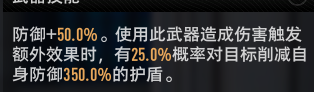 使用此武器造成伤害触发额外效果时,有 50.0% 概率对目标削减自身防御 350.0% 的护盾。