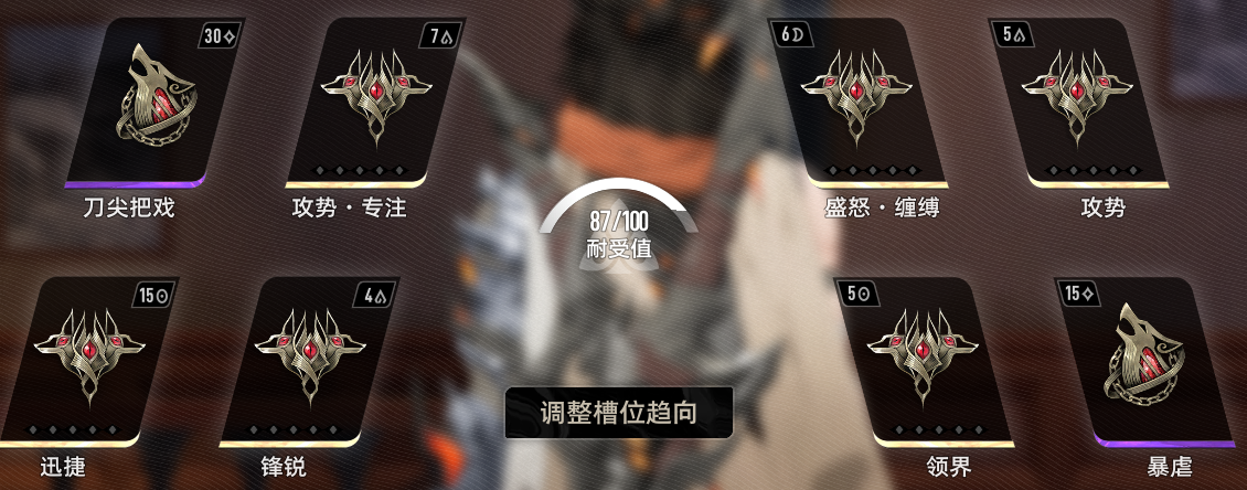 刀尖把戏(最核心的魔之契,攻击范围大大增加),攻势·专注,锋锐,迅捷,领界(刷小怪本带),盛怒·缠缚,攻势,暴虐。