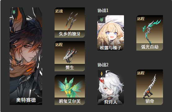 奥特赛德的最佳配队,这个阵容三个角色都可以免费获得,榛子提供增伤+奶,主角提供武器增伤,奥特赛德作为以近战武器打伤害的角色,这些都是非常需要的乘区。榛子如果没有专武,那就随便带一把提高技能耐久的武器就行。