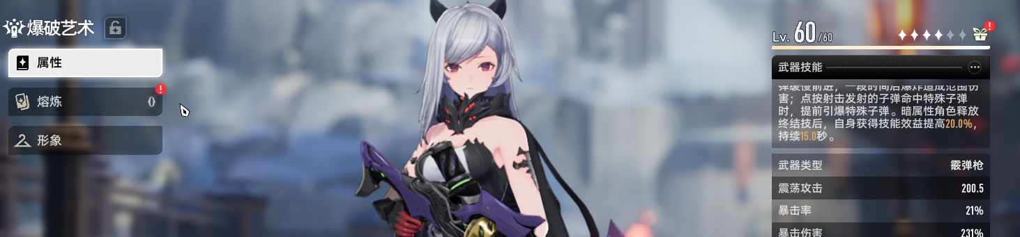 远程武器方面,贝蕾的毕业武器却不是她的精通类型,而是霰弹枪爆破艺术,这把武器可以提供一个技能效益提高的buff,对贝蕾帮助非常大。
