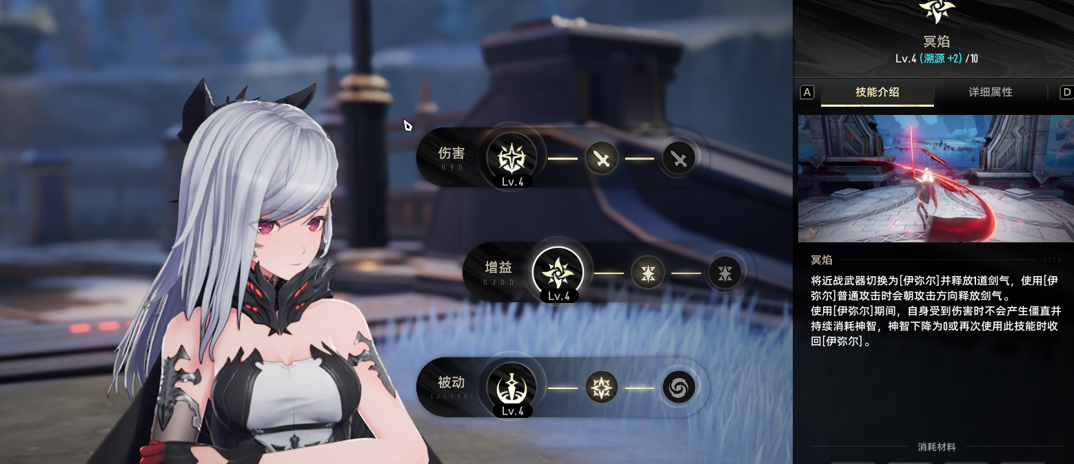 而贝蕾的大招冥焰是她的核心技能,在这里会引入一个新的概念——同律武器。同律武器是完全独立的系统并且享受独特的魔之楔加成,在切换成同律武器后,普通的武器魔之楔加持会失效。而贝蕾在开启后在挥舞剑气的同时也会带来巨量的神智消耗,所以技能效益是她最重要的属性,而她的被动技能回转则会释放E与普攻平a时恢复神智,即使在开启大招后这个效果也是存在的 所以这会为她延长大招输出形态出力。