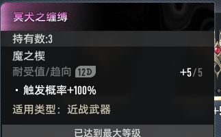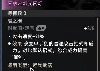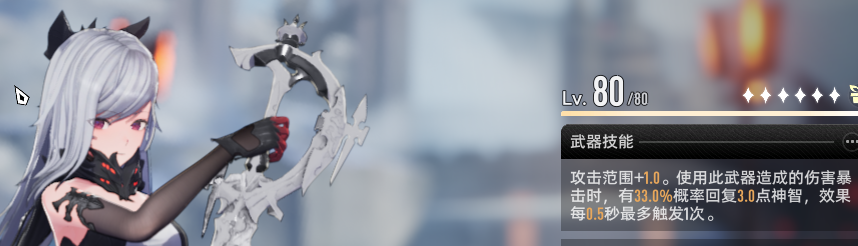 攻击范围 + 2.0。使用此武器造成的伤害暴击时,有 66.0% 概率回复 3.0 点神智,效果每 0.5 秒最多触发 1 次。