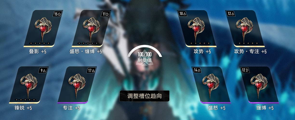 满熔炼等级的【无序奇点】本身可以提供150%触发概率,配合【无序奇点】本身33%的触发概率基础值,只需要额外50%触发概率属性就可以实现面板达到100%触发概率了,所以满熔炼等级的情况下,除了【夜魔之盛怒·缠缚】之外,不需要额外的触发概率属性了,如果是低熔炼等级、或者没有【夜魔之盛怒·缠缚】的情况下,可以使用【夜魔之缠缚】,除了触发概率之外,【无序奇点】的培养主要以攻击力、暴击率、暴击伤害、多重射击为主要培养方向,因为[切割攻击加成]和[攻击力加成]是两个乘区,所以建议两个都带,然后根据魔之楔情况,携带【夜魔之叠影】、【夜魔之专注】、【夜魔之盛怒】即可,如果耐受值上限或者没有解锁高级魔之楔,【邪龙之整备】、【邪龙之无患】也是不错的选择。
