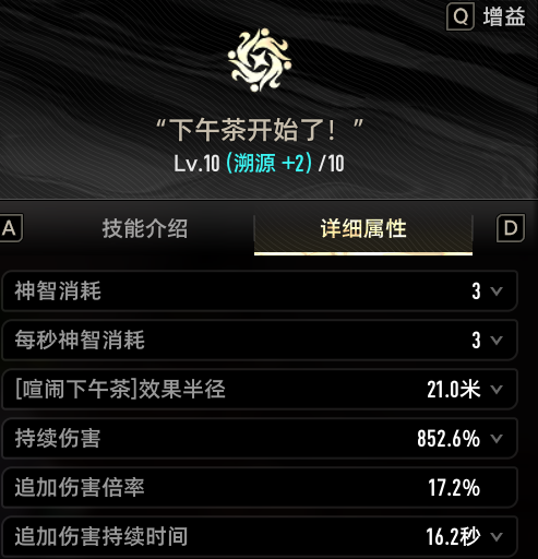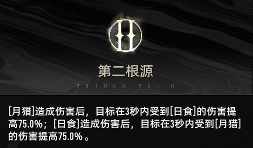 核心技能,能够使[月猎]具备聚怪能力,并提高[日食]的伤害倍率,[月猎]的攻击范围要大于[日食],同时还可以增加远程武器的触发概率,用于配合被动技能效果,终结技神智消耗很大,因此适当堆一些技能效益收益相当高。