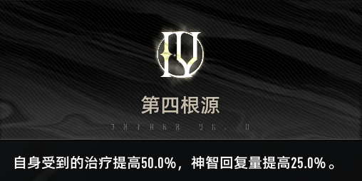 第四根源增幅妮弗尔夫人受到的所有治疗效果和神智回复效果,包括嗅盐、凝神嗅盐、魔灵支援技能、魔之楔回复效果、自然回复效果等,并会向上取整,比如凝神嗅盐1会给角色回复25神智,解锁第四根源之后,回复量为33,增加妮弗尔夫人的续航能力。