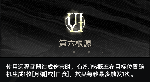 基于远程武器的触发概率,[月猎]生成后,有概率在相同位置生成1枚[日食],[日食]生成后,有概率在相同位置生成1枚[月猎]。通过此效果生成的[月猎]和[日食]不会受到[雾海安魂]的强化。