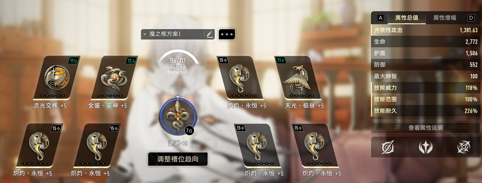 【狩月人·光】的核心是终结技提供的BUFF,因此首要属性是攻击力、技能耐久,【金乌之流光交辉】和【契约者之炽灼·永恒】的搭配是最契合角色自身属性需求的,搭配【全盛·安神】的神智回复和【天光·极昼】提供的多方面属性,如果队伍中有其他角色携带【全盛·安神】,可以考虑更换为【全盛·振奋】,【契约者之炽灼·永恒】也可以根据自身的魔之楔情况更换为【契约者之炽灭】或【海妖之羽翼·鼓舞】。