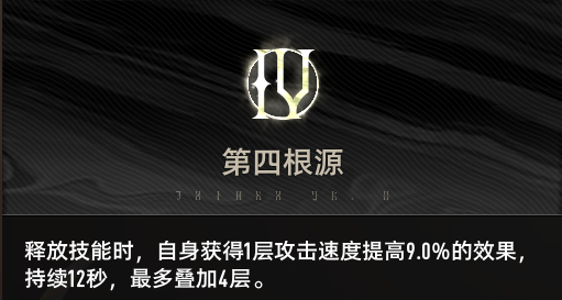 释放技能的时候,增加攻击速度,近战武器和远程武器都可以吃到这个加成,但是层数叠加的时候,原有的层数持续时间不会刷新,加成小,获得这个加成需要消耗的神智也不是一个小数目,感觉是结合第一溯源,让主角快速释放技能之后提高短时间内的续航输出能力,但是数值给的太低,作用不大。